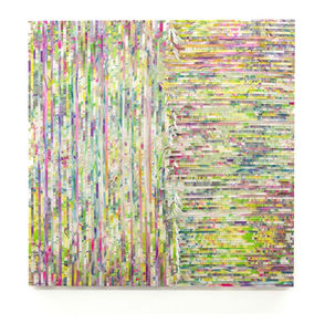 作者が制作する"色むら模様”の工程で生まれた実験布や一度役目を失った布を再利用するプロセスと、不規則な模様と規則的な行為によるバイロジック表現が織りなす、染めの色むら模様を再構築した新たな試みで制作された作品群です。